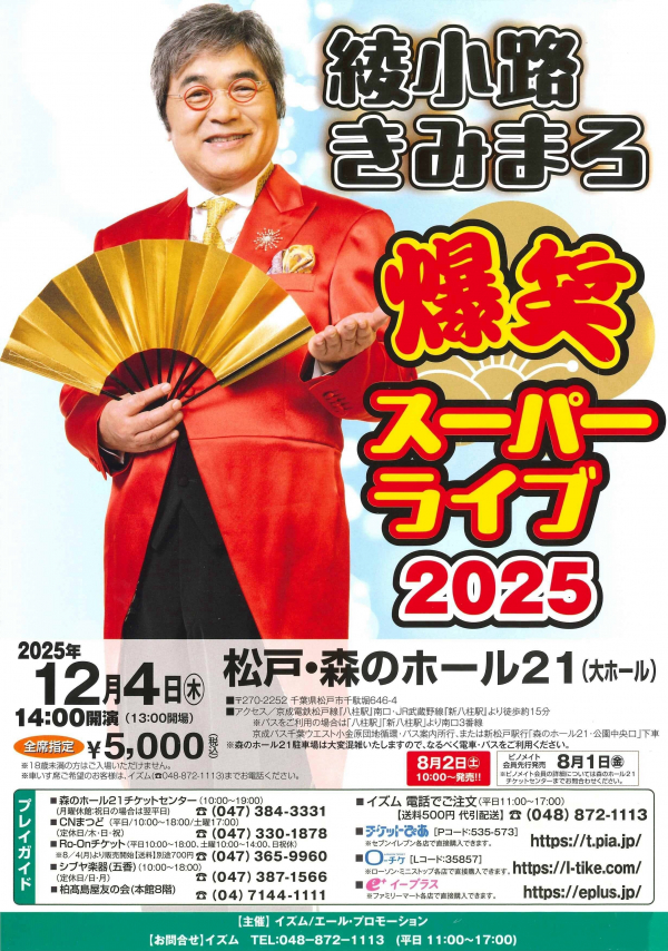 ※18歳未満の方はご入場いただけません。 ※車いす席ご希望のお客様は、イズム(☎048-872-1113※平日11時~17時)までお電話ください。 ※森のホール21駐車場は大変混雑いたしますので、なるべく電車・バスをご利用ください。 |